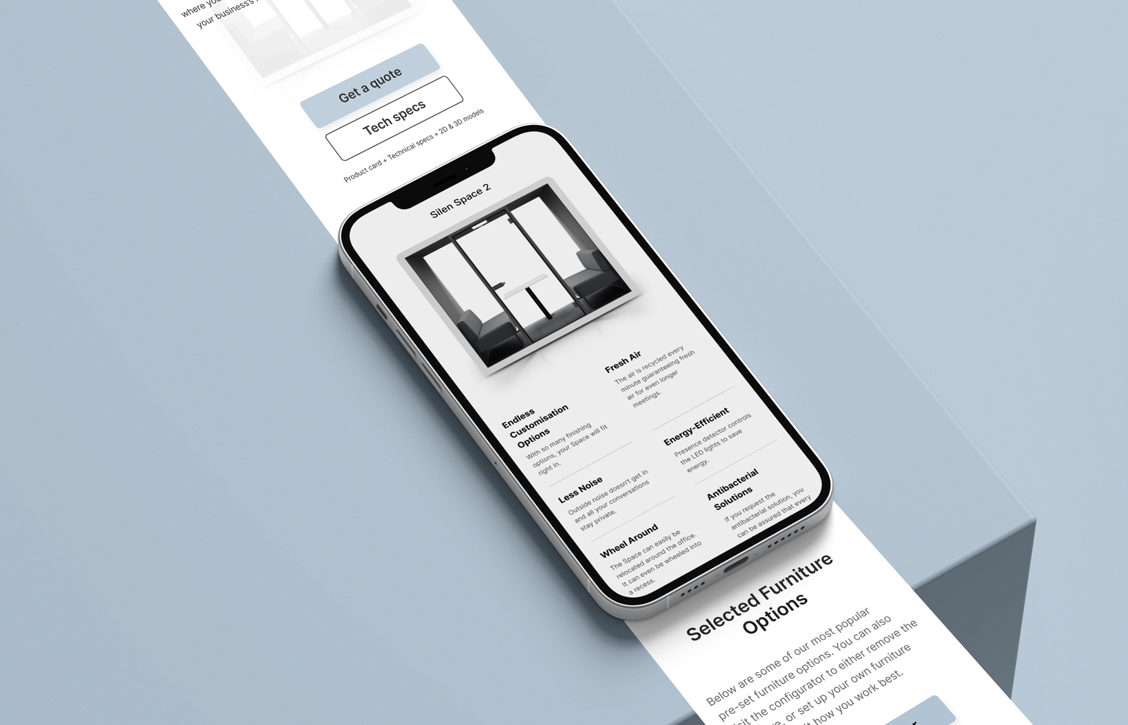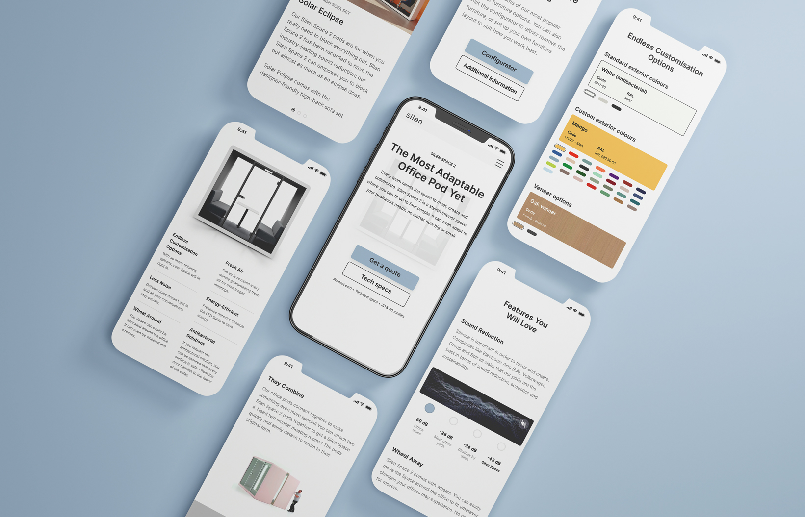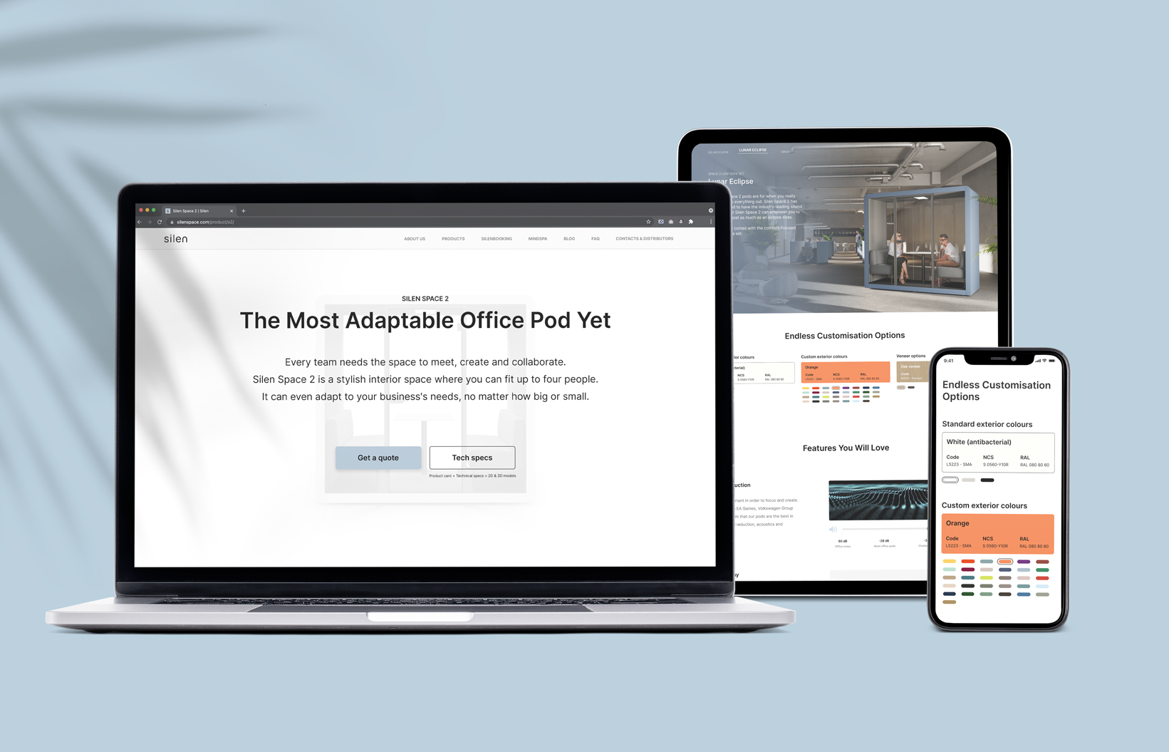 Silen is an Estonian manufacturer of unique silent workstations and quiet rooms that give everyone the chance to concentrate in an open-plan office or public space. But how can these products be presented attractively on the web so that everything that matters is presented in an appetising and innovative way? To achieve this, we used a minimalist design spiced up with 3D images and modern interactive sequences. The aesthetics and perfection of the Silen brand must be expressed in every leaf. Pixelperfect photos, thoughtful texts and Scandinavian use of colour. The content types and layout of product pages keep the user's interest to scroll down towards the bottom of the page, and with their mastery, the number of business enquiries has increased significantly and they have become an integral part of the website.
